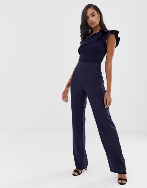 Vesper one shoulder wide leg jumpsuit with frill detail in navy Very well made.